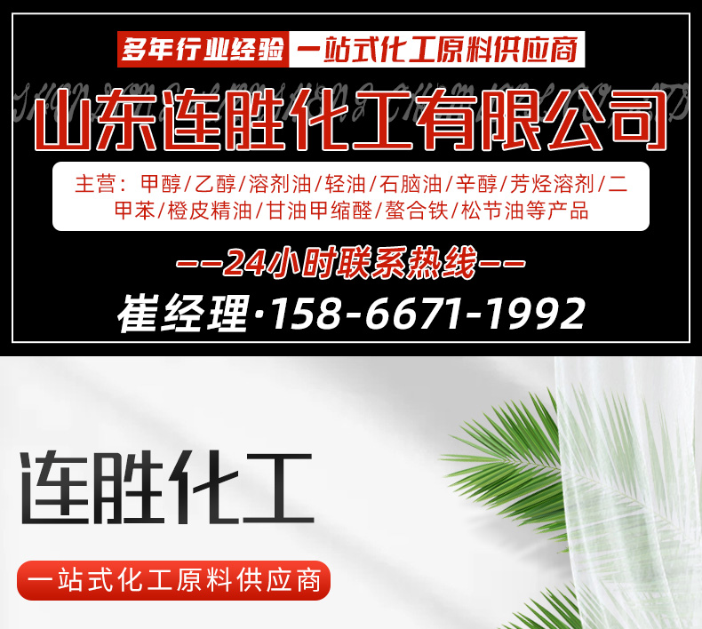 山東連勝化工有限公司主營:二氯甲烷。二氯乙烷。冰醋酸。乙醇 碳酸二甲酯。鈦酸四異丙酯。甲醇鈉。 苯酚。石油醚。二甲苯。四氯乙烯。mtbe。碳五 異丁醇。異辛醇。正辛醇。正己烷。正庚烷。甲醇。三乙醇胺等,期待您的咨詢!